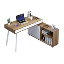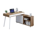 Moderno escritorio en forma de L con una combinación de colores marrón claro y blanco. El escritorio tiene dos cajones blancos y patas blancas. La sección lateral del escritorio incluye un compartimento de almacenamiento cerrado con una puerta blanca y estantes abiertos. Requiere Armado.
