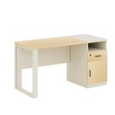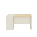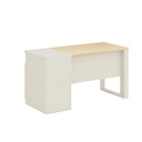 Escritorio moderno con una combinación de colores claros. Presenta una superficie de trabajo principal en tono madera clara y una estructura de soporte en color blanco o crema. En el lado derecho, el escritorio incorpora una unidad de almacenamiento integrada, también en tonos claros, que incluye un cajón con tirador y un compartimento con puerta, ambos con frentes en tono madera clara, así como un estante abierto en la parte superior. Las patas del escritorio, en el lado izquierdo, son de metal con un diseño en forma de U invertida, también en color blanco o crema. Requiere Armado.