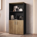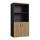 Armario de oficina alto semiabierto. MDP con revestimiento melaminico. El armario es de color grafito oscuro, con la parte superior y la base en un tono de madera claro. La parte superior consta de dos estantes abiertos, ideales para exhibir objetos o almacenar documentos de fácil acceso. La parte inferior cuenta con dos puertas de madera en un tono claro, que ocultan un espacio de almacenamiento cerrado, con tiradores metálicos verticales. Su diseño combina la funcionalidad de almacenamiento abierto y cerrado, haciéndolo versátil para diferentes tipos de ambientes, como oficinas o estudios. Peso permitido: 20 kg. Requiere Armado.