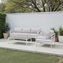 Juego de sala para exteriores de aluminio. El conjunto incluye un sofá de tres plazas, un sillón individual y una mesa de centro a juego. Material y Color: El conjunto está construido con un marco de aluminio con recubrimiento en polvo de color blanco, conocido por ser resistente a la oxidación y a la intemperie. Cojines: Los cojines son de color gris claro, con un generoso acolchado de espuma de alta densidad para mayor comodidad. Son repelentes al agua y resistentes a los rayos UV. Mesa de Centro: La mesa de centro a juego presenta una superficie con un acabado de imitación madera, que es duradera y fácil de limpiar. Diseño: El diseño es moderno y minimalista, con líneas limpias y reposabrazos amplios, ideal para espacios exteriores como patios o jardines.
