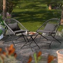 - Transforma tu jardín, patio o balcón en un oasis elegante y sofisticado con el set de exterior Mila. Perfecto para desayunos acogedores, cenas íntimas o simplemente para disfrutar de una taza de té, este elegante y funcional conjunto de muebles es imprescindible para cualquier espacio exterior. - Fabricado en resistente ratán sintético. - Plegado práctico: la mesa y las sillas plegables se guardan de forma compacta cuando no se usan, lo que lo convierte en el conjunto ideal para patios o balcones pequeños donde el espacio es limitado. - Asientos cómodos: con dos sillas acolchadas, el conjunto ofrece un asiento mullido, garantizando la máxima comodidad mientras disfruta de comidas al aire libre con amigos y familiares. - Construcción robusta: fabricadas con una estructura de acero con recubrimiento en polvo, las sillas y la mesa están diseñadas para resistir el uso diario y la intemperie, brindándole años de disfrute.