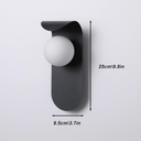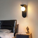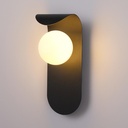 Aplique de pared de estilo moderno. Consiste en una base de metal de color negro mate, con una forma alargada y curvas suaves en la parte superior e inferior. En la parte central superior de esta base, se encuentra una esfera de cristal opalino o esmerilado que emite una luz cálida y difusa. De uso decorativo y funcional, ideal para ambientes contemporáneos como dormitorios o salones. Foco G9 no incluido.