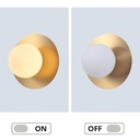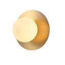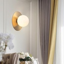 Lámpara de pared moderna y minimalista con un diseño redondo. Consiste en una base circular de color dorado o latón y una esfera frontal de vidrio esmerilado más pequeña que emite una luz cálida y difusa. El diseño evoca un estilo contemporáneo y elegante, ideal para crear un ambiente acogedor en diversos espacios como dormitorios, salas de estar o pasillos. Foco G9 se vende por separado.