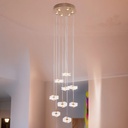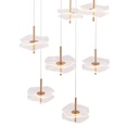 Presenta una base circular de color bronce o cobre en el techo, de la cual descienden nueve cables individuales. Cada cable termina en una pequeña luminaria que incorpora un disco translúcido, diseñado para asemejar una mariposa o una forma floral estilizada. Estos discos tienen un acabado que sugiere un material como el acrílico o el vidrio esmerilado, permitiendo la difusión de la luz. Las nueve luces están dispuestas a diferentes alturas, creando un efecto escalonado y dinámico que añade profundidad y movimiento al diseño general. El diseño es moderno y elegante, con líneas limpias y una estética minimalista que se integra bien en diversos ambientes contemporáneos.