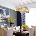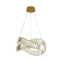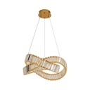 Lámpara LED colgante de diseño moderno y elegante. Presenta un diseño distintivo en forma de espiral o hélice, con elementos curvados que se entrelazan. Está fabricada con una estructura de metal en tono dorado y adornada con múltiples cristales que recubren las formas curvas. Incorpora iluminación LED integrada a lo largo de los bordes internos de las formas curvas, lo que proporciona una luz difusa. Su módulo led 3CCT permite la selección de la temperatura de luz de la luminaria entre luz fría, luz neutra y luz cálida. Su combinación de metal dorado y cristales le confiere un aspecto contemporáneo y sofisticado, ideal para espacios interiores como salas de estar, dormitorios o comedores.