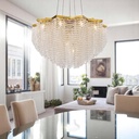 Lámpara colgante de estilo lujoso y elegante. Presenta una estructura superior dorada de la que penden múltiples hilos de cristales transparentes, creando una forma de cascada o cortina que se ensancha hacia la parte inferior. La lámpara está suspendida por cables finos desde una base dorada en el techo, y los cristales brillan, lo que le da un aspecto resplandeciente.