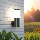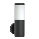 Aplique de pared exterior de diseño moderno y cilíndrico, con un acabado en color negro. Presenta una sección superior translúcida de color blanco que permite la emisión de luz, mientras que la parte inferior es opaca y de color negro. Este tipo de luminaria está diseñada para ser montada en la pared y es adecuada para la iluminación de exteriores como jardines, terrazas o porches.